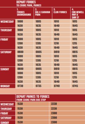 Western Road Liners operates regular ticketed services between Parkes and Forbes during the Festival period.