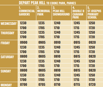 Western Road Liners operates regular ticketed services between Parkes and Peak Hill during the Festival period.