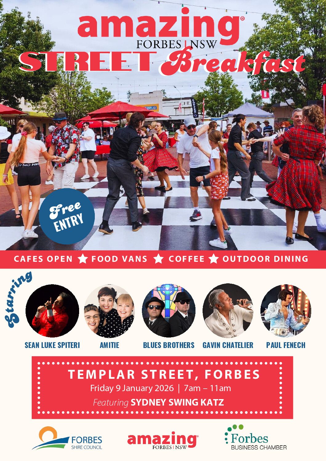 Amazing Forbes Street Breakfast is back — and it’s bigger than ever! Held in conjunction with the iconic Parkes Elvis Festival, this lively morning event transforms the heart of Forbes into a celebration of music, community, and fun. Enjoy great entertainment, delicious food vans, and a dance floor to get your groove on. Relax at our street breakfast tables under shady umbrellas, browse the merch